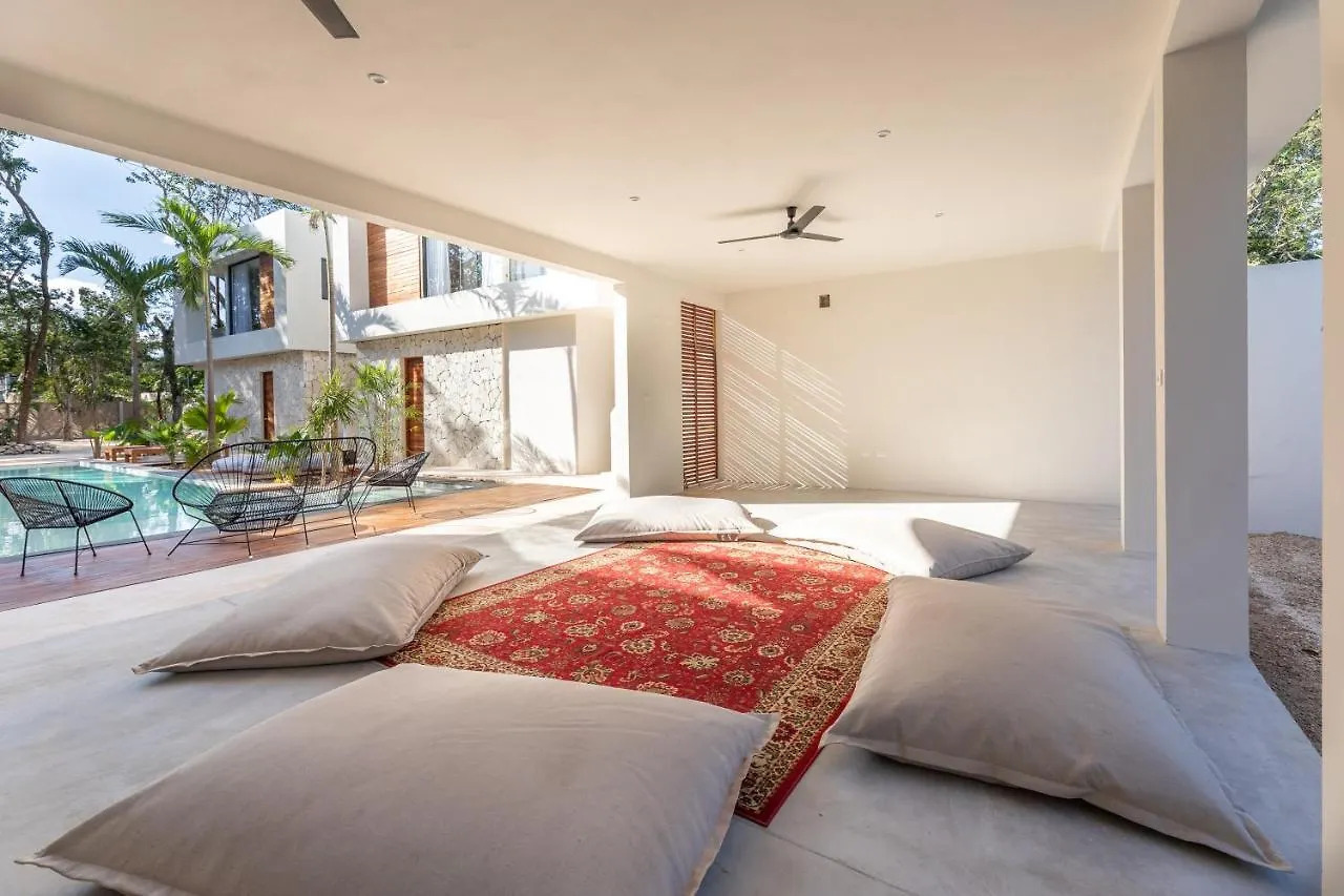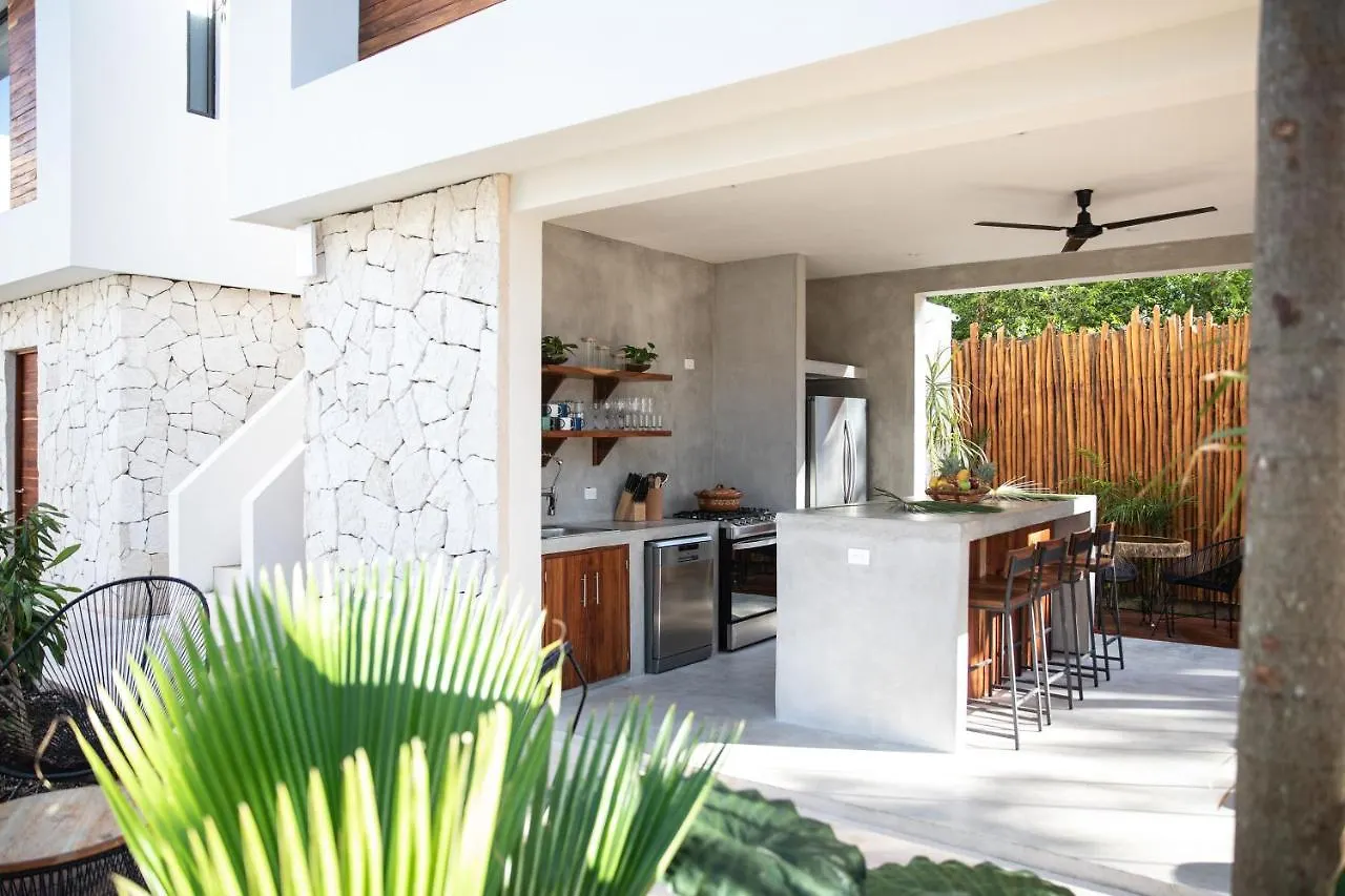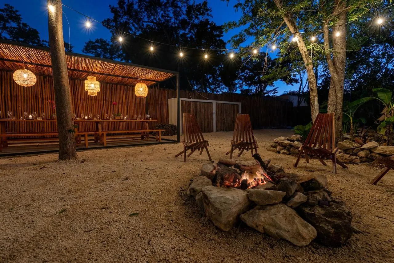 Hacienda 21, 2019 in Tulum spans 1,741.19 m2 of land with 526.36 m2 built, featuring 9 suites (including luxury, chill-out, and jacuzzi suites), a fully equipped kitchen, gym, pool, fire pit, and multipurpose room. Developed with Jerome Textier and Zepto Design and Construction.